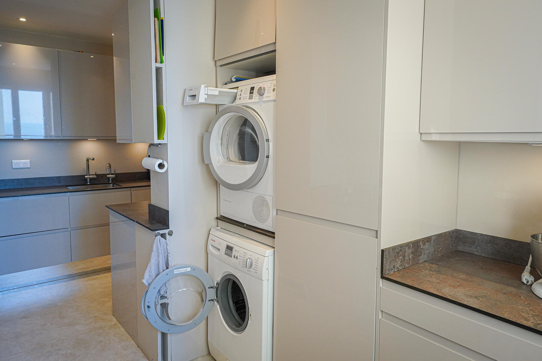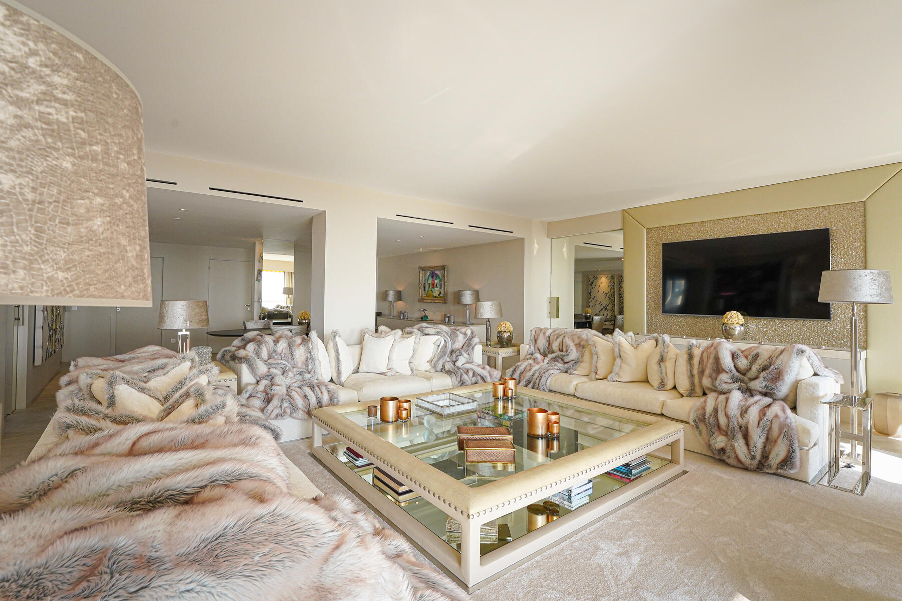 A grand entrance A dining room A double living room opening onto a terrace with panoramic sea and city views A master bedroom in front opening onto a terrace with panoramic sea and city views. A large dressing room and a large bathroom with bath, shower and toilet attachment. Two en-suite bedrooms with en-suite bathrooms Two offices, one of which can be used as a bedroom A large fully equipped kitchen with service entrance A guest water closet A service room with shower room, water closet, kitchenette and independent entrance that can be used as an en-suite bedroom The apartment is fully air-conditioned. The apartment enjoys a triple exposure with a view of the mountains and the city on the east side, a magnificent panoramic sea view, starting from the Italian coast to the rock on the south side, and a sea, city and mountains view on the west side. A triple closed box Three cellars